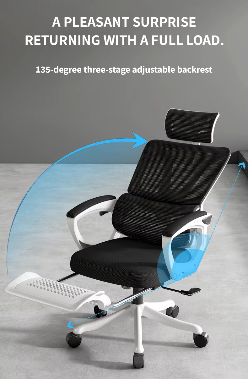 Khung thép chắc chắn kết hợp vải lưới Mesh cao cấp tạo nên dáng ghế thanh thoát, thông thoáng. Tay vịn cong ôm tự nhiên, bánh xe PU xoay êm 360°, cùng ben hơi 3 tầng cho phép người dùng tùy chỉnh độ cao, độ nghiêng theo nhu cầu.