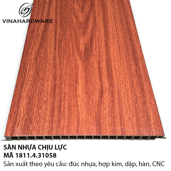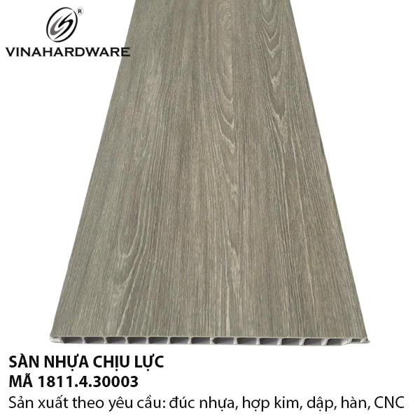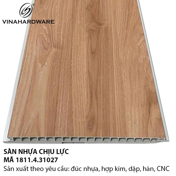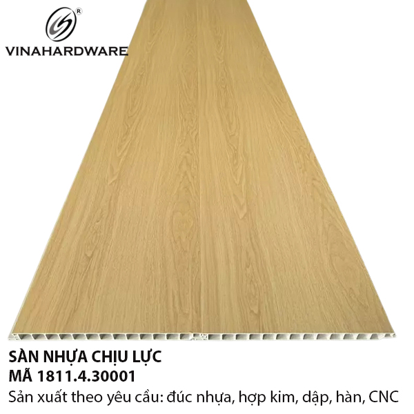 Tấm sàn nhựa chịu lực Vinahardware được thiết kế với độ dày 23mm, cấu trúc rỗng tổ ong gia tăng khả năng phân bổ lực, giúp sản phẩm chịu được tải trọng tĩnh lên tới 500kg/m². Bề mặt giả vân gỗ tạo cảm giác tự nhiên, đồng thời chống nước và dễ dàng vệ sinh.