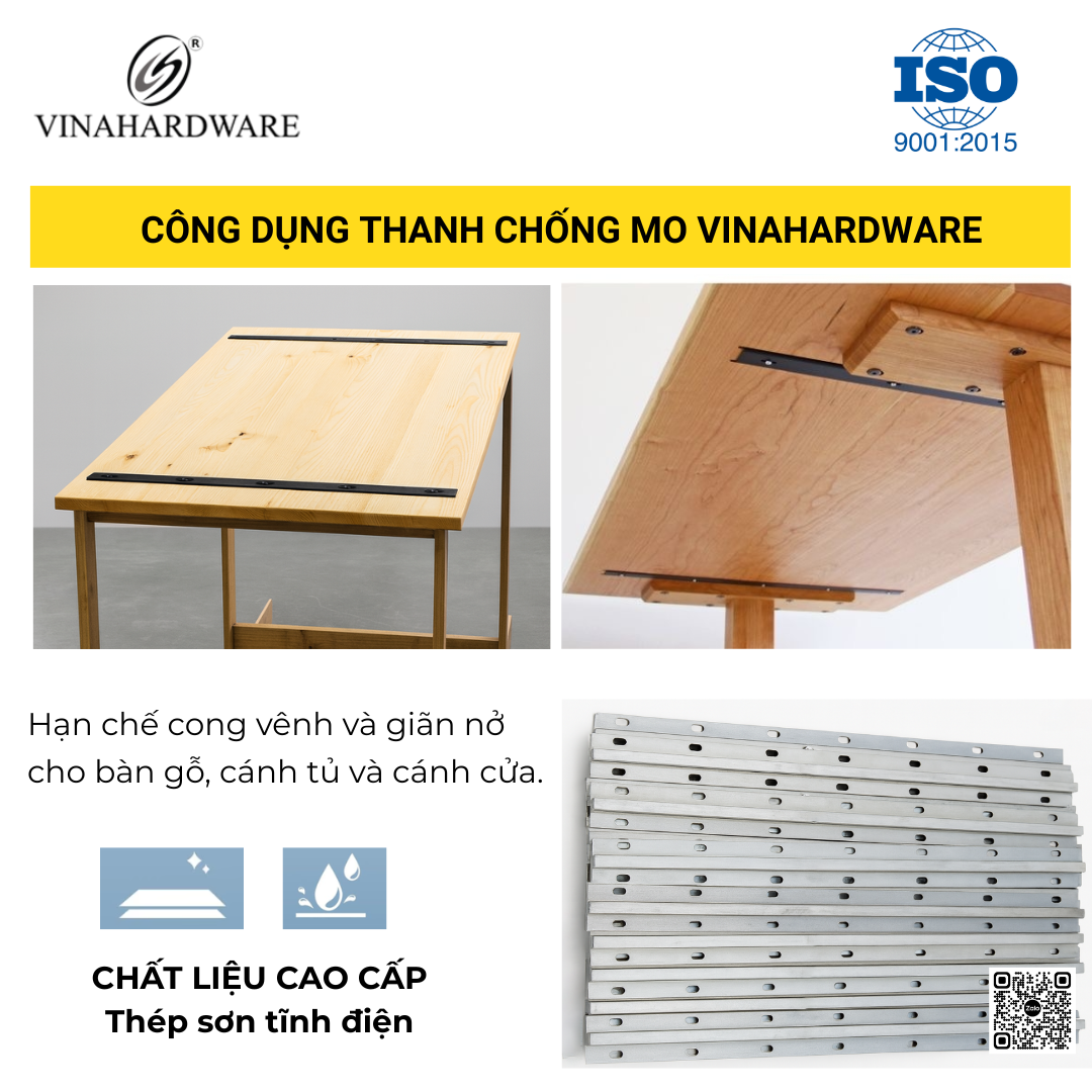 Thanh chống mo 2400.1.03006 được sản xuất từ thép tấm dày 3.0mm, bản rộng 40mm, có sống lưng chịu lực 10x10mm giúp chống cong vênh, chống biến dạng mặt bàn – mặt ghế – ván tủ trong ngành gỗ nội thất.